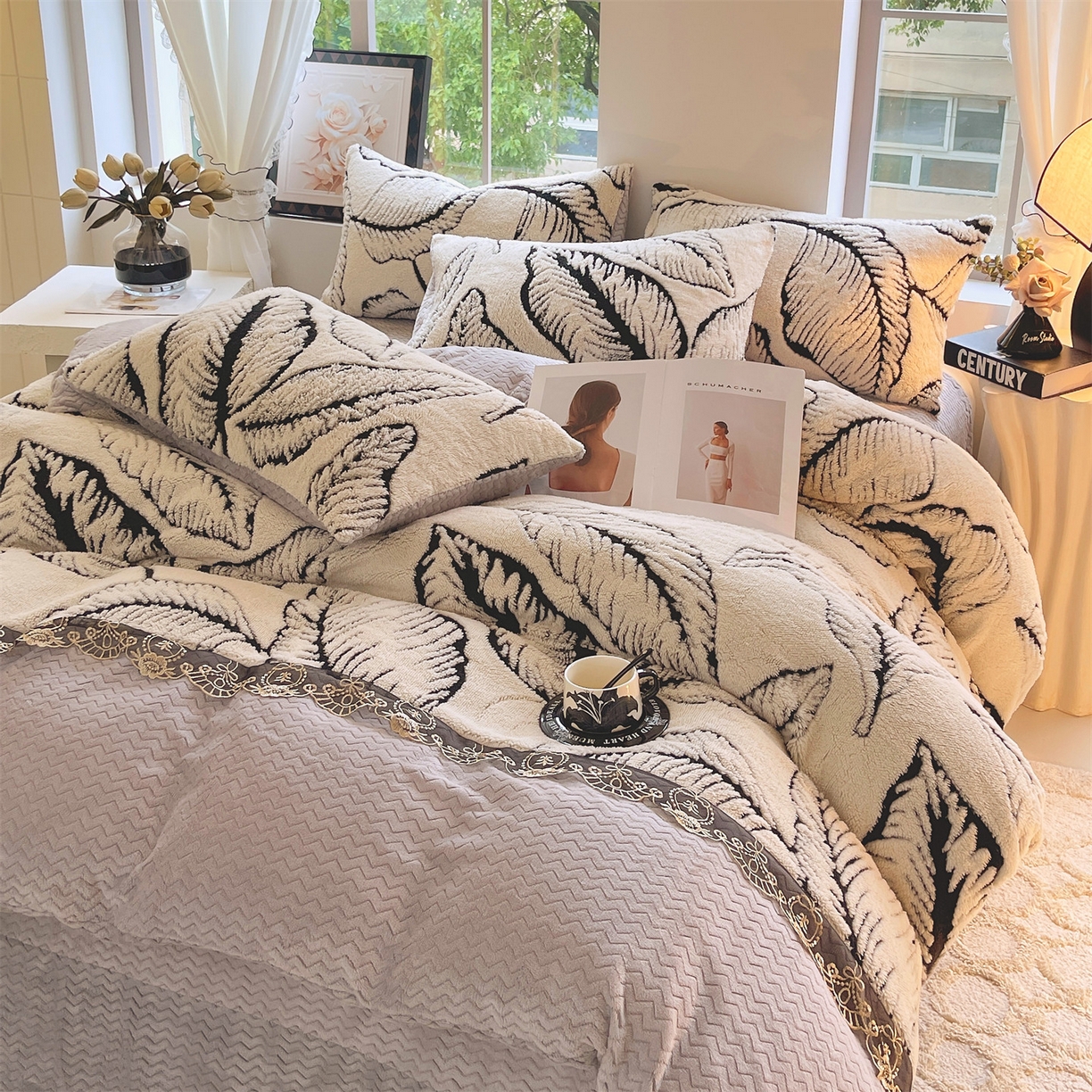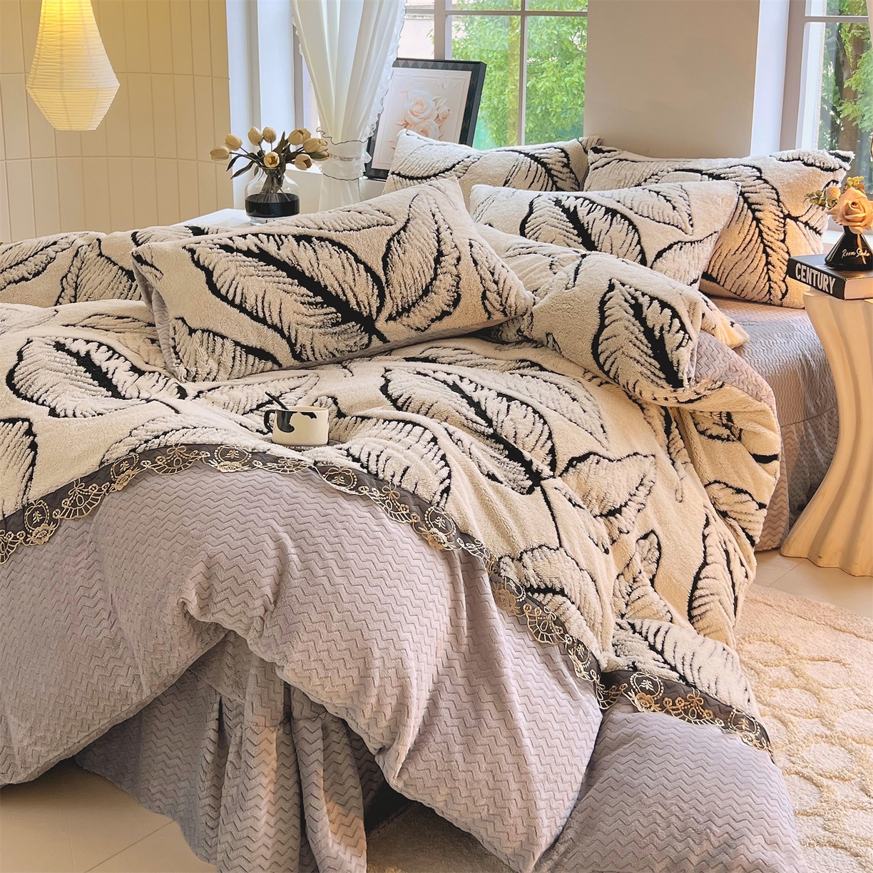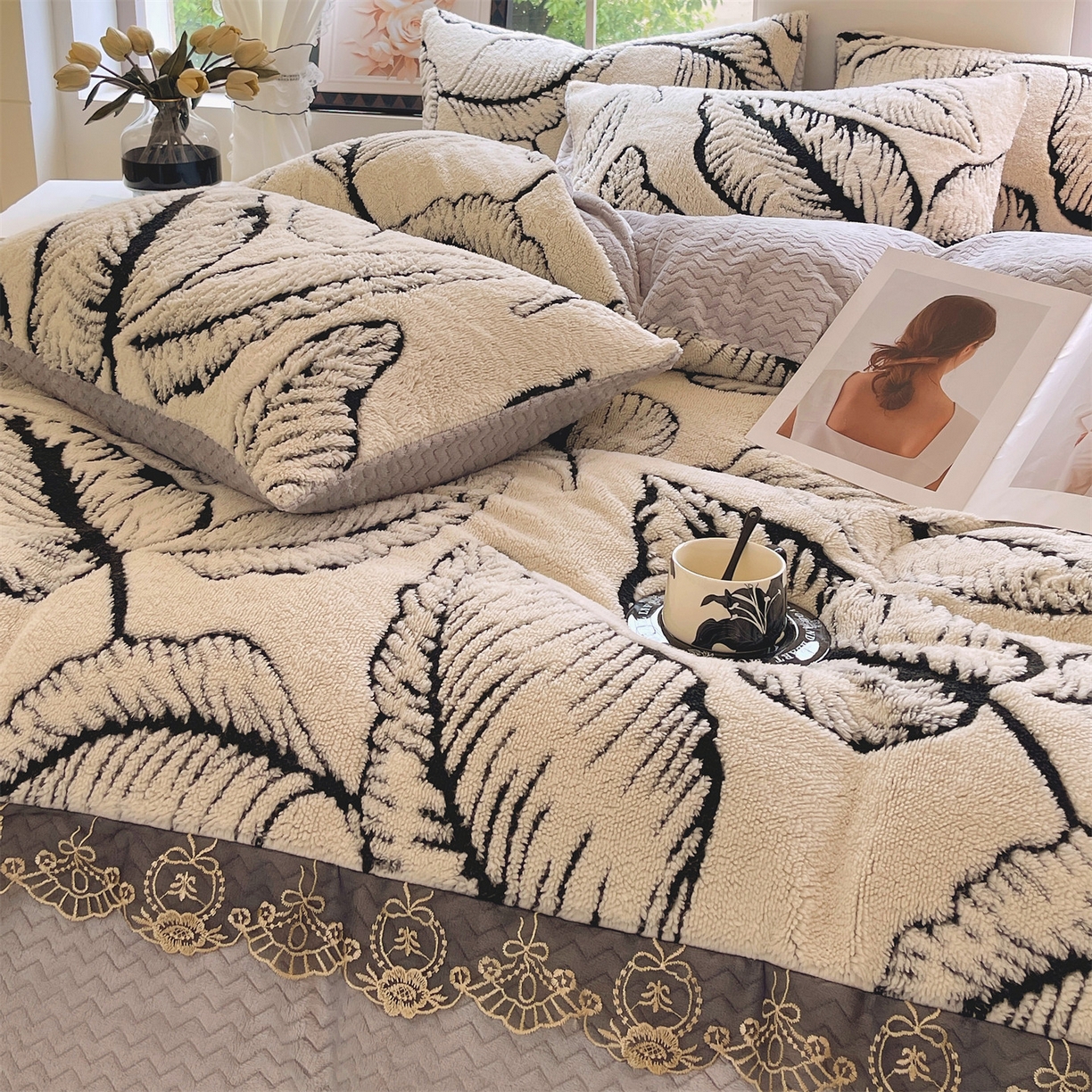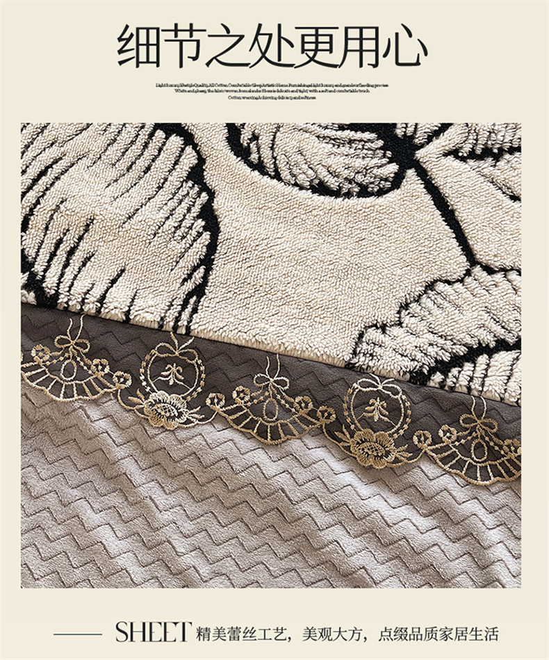 天之澜家纺 2025新款法式阳离子立体牛奶绒蕾丝四件套 一叶深情-乳白