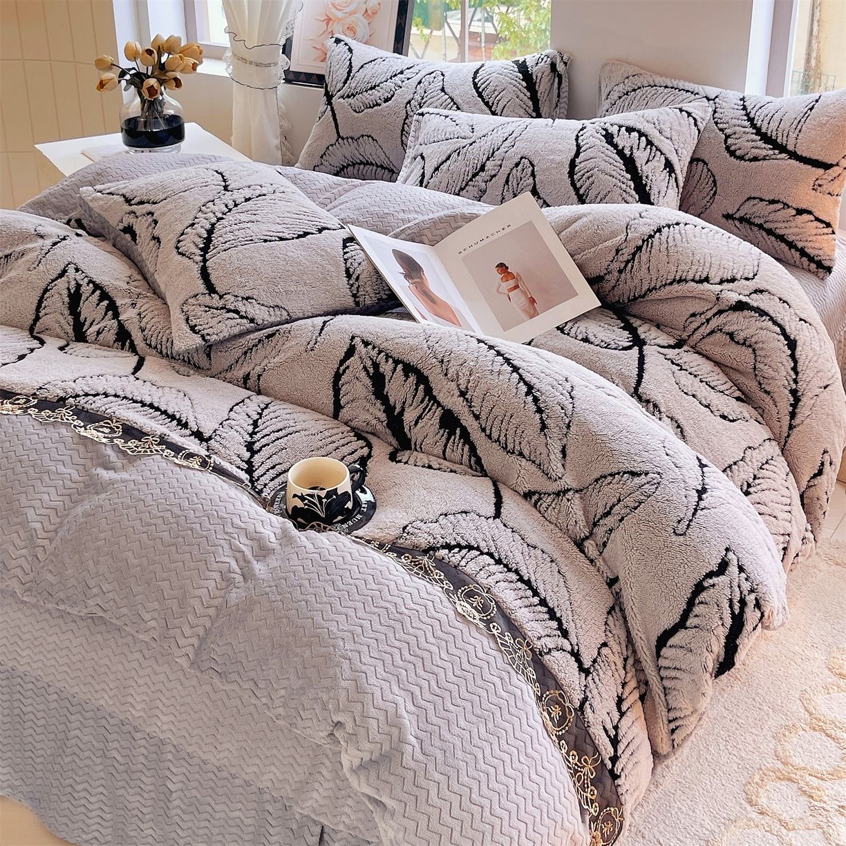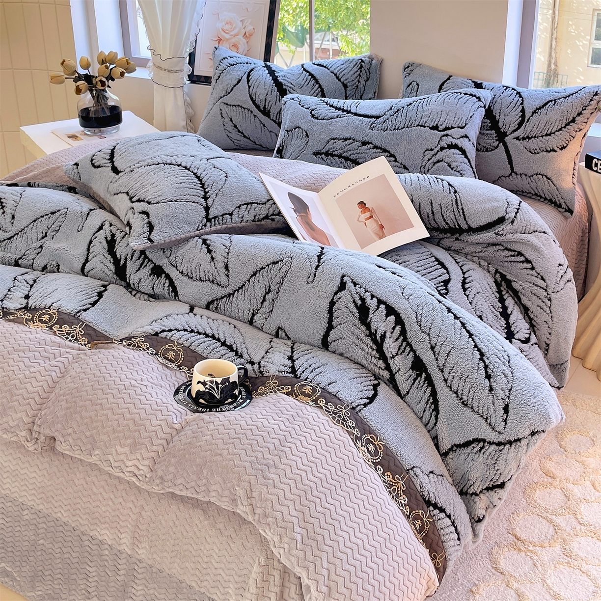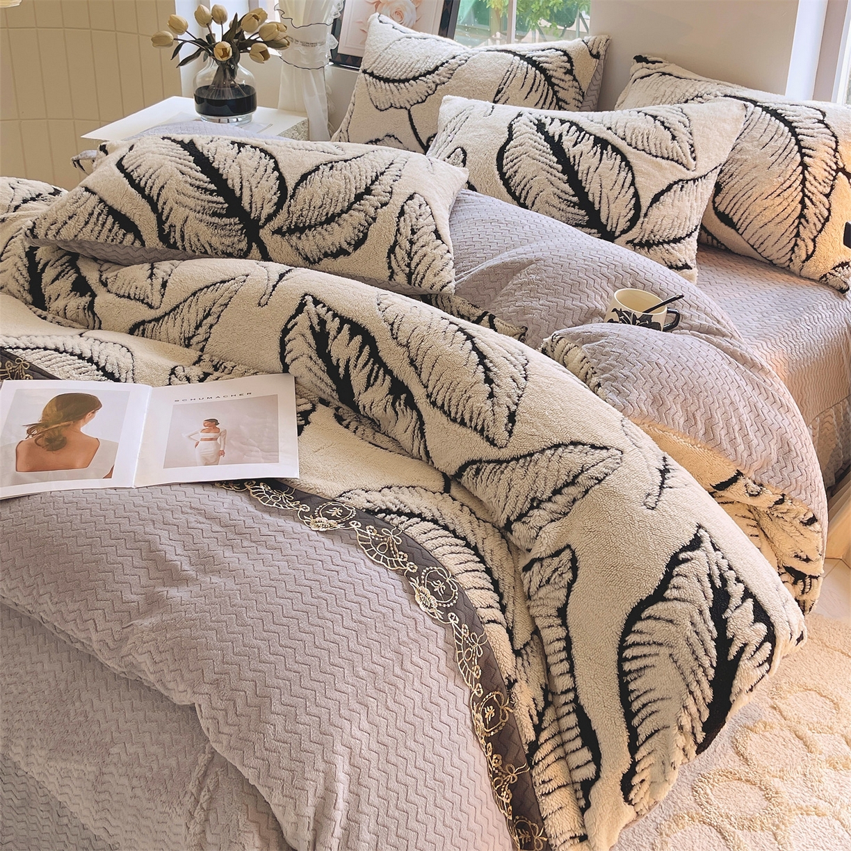 天之澜家纺 2025新款法式阳离子立体牛奶绒蕾丝四件套 一叶深情-浅灰