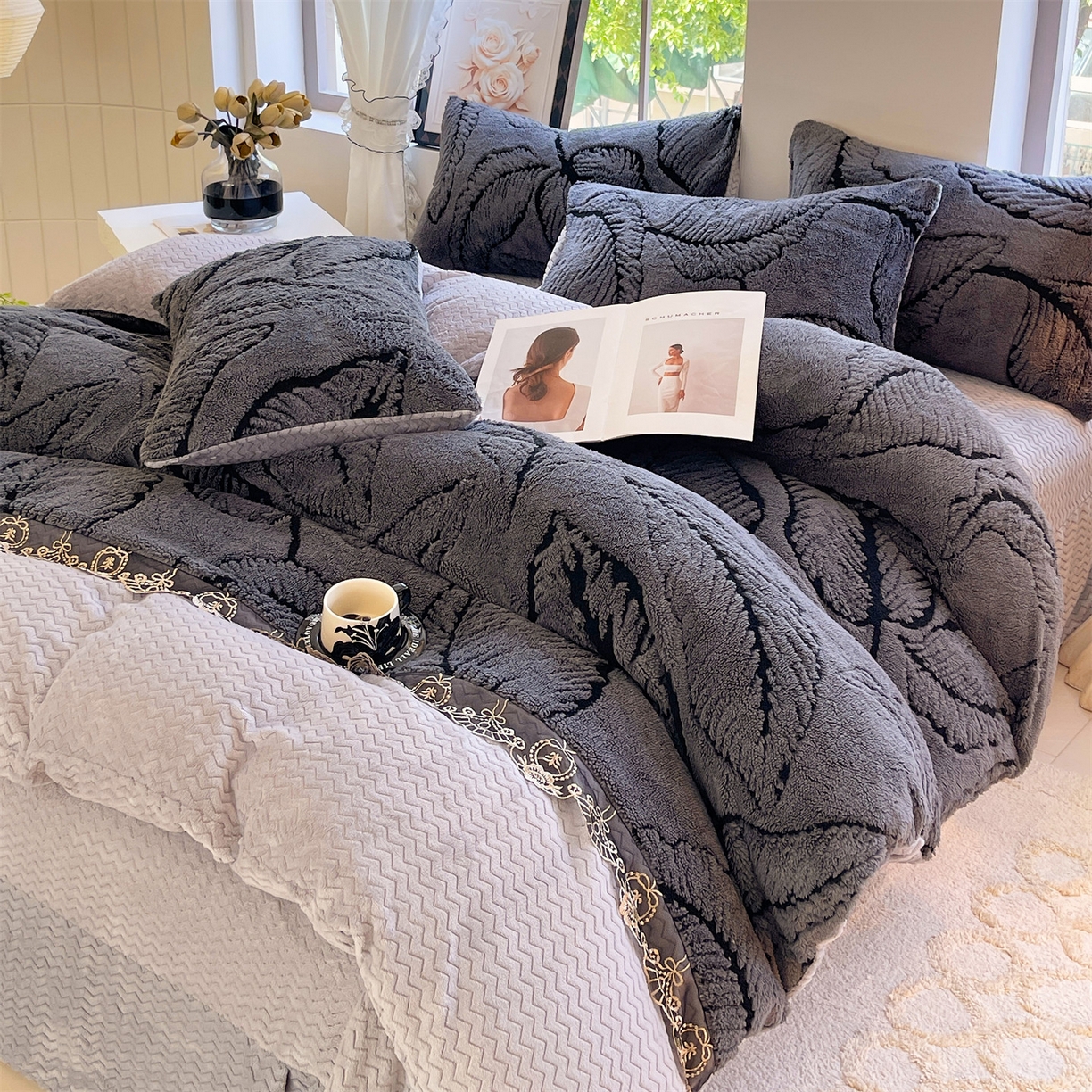 天之澜家纺 2025新款法式阳离子立体牛奶绒蕾丝四件套 一叶深情-深灰