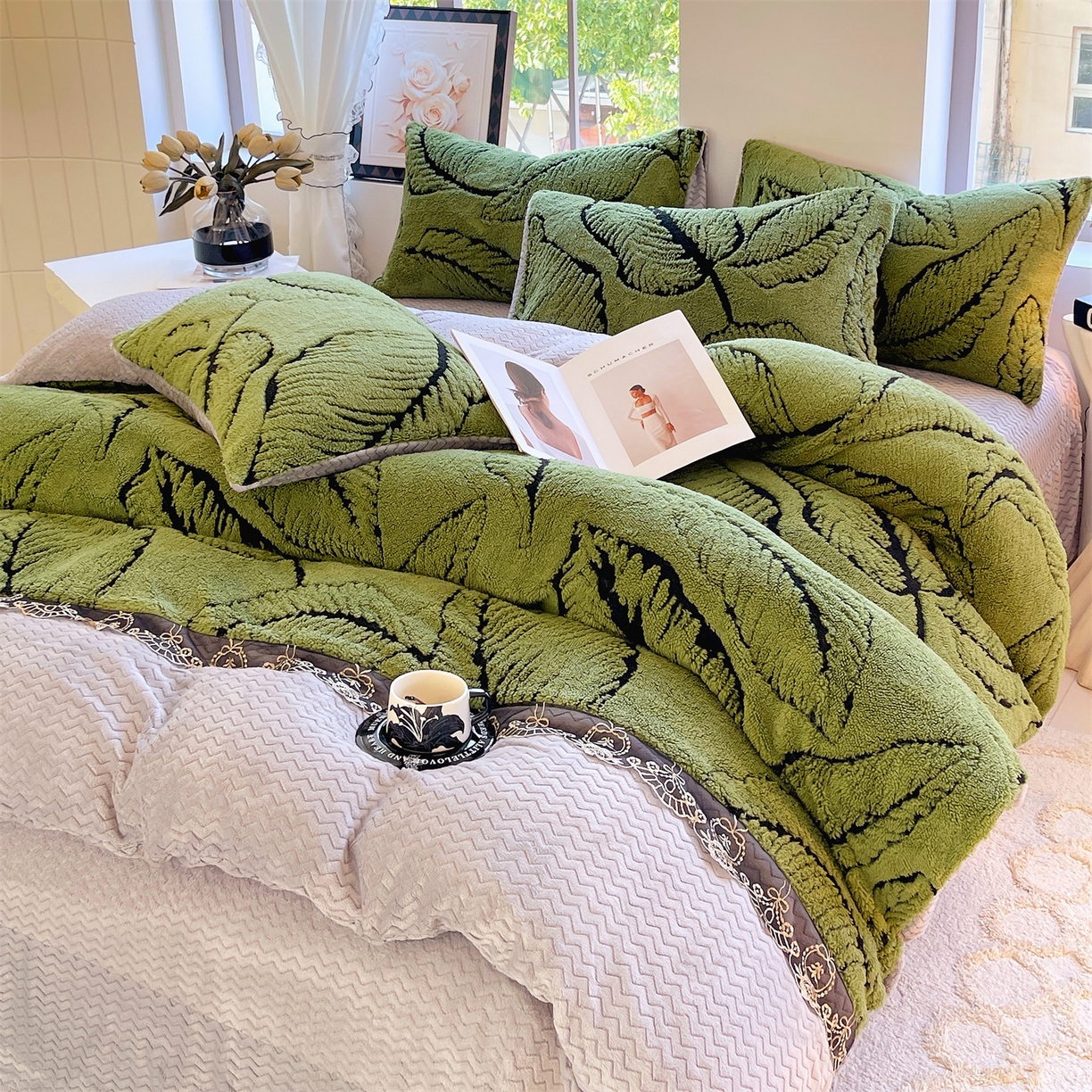 天之澜家纺 2025新款法式阳离子立体牛奶绒蕾丝四件套 一叶深情-草绿