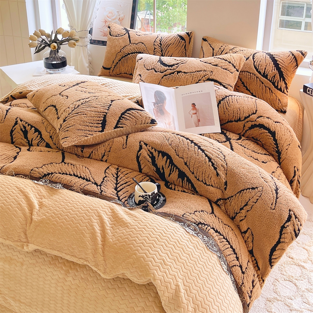 天之澜家纺 2025新款法式阳离子立体牛奶绒蕾丝四件套 一叶深情-卡其